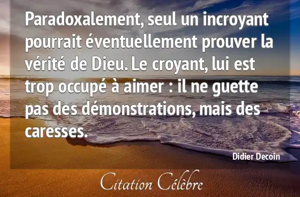 Paradoxalement, seul un incroyant pourrait éventuellement prouver la vérité de Dieu. Le croyant, lui est trop occupé à aimer : il ne guette pas des démonstrations, mais des caresses.