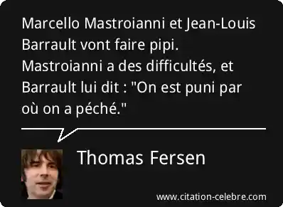 Marcello Mastroianni et Jean-Louis Barrault vont faire pipi. Mastroianni a des difficultés, et Barrault lui dit : "On est puni par où on a péché."