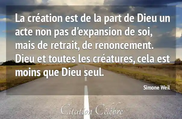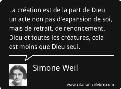 La création est de la part de Dieu un acte non pas d'expansion de soi, mais de retrait, de renoncement. Dieu et toutes les créatures, cela est moins que Dieu seul.