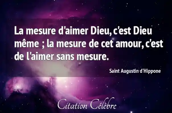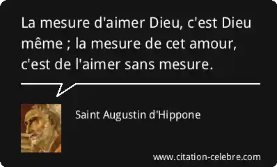 Cette citation de Saint Augustin est une expression profonde de l'amour théologal. Elle signifie que l'amour que l'on porte à Dieu est un don qui émane de Dieu lui-même. L'acte d'aimer Dieu n'est pas une simple réponse humaine, mais une participation à la nature divine. Le plus important est que cet amour doit être illimité. "La mesure de cet amour, c'est de l'aimer sans mesure" exhorte le croyant à un engagement total, sans restriction ni calcul, envers Dieu.