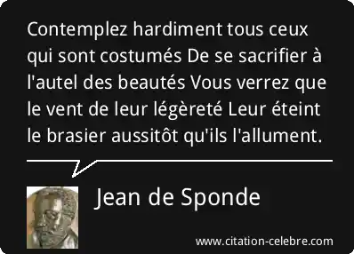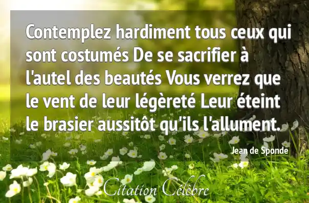 Contemplez hardiment tous ceux qui sont costumés De se sacrifier à l'autel des beautés Vous verrez que le vent de leur légèreté Leur éteint le brasier aussitôt qu'ils l'allument.
