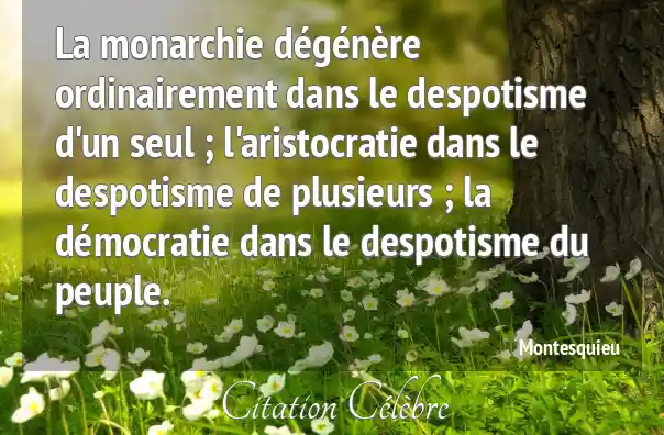 La monarchie dégénère ordinairement dans le despotisme d'un seul ; l'aristocratie dans le despotisme de plusieurs ; la démocratie dans le despotisme du peuple.