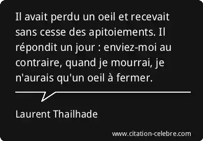 Il avait perdu un oeil et recevait sans cesse des apitoiements. Il répondit un jour : enviez-moi au contraire, quand je mourrai, je n'aurais qu'un oeil à fermer.