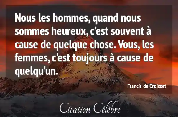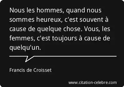 Nous les hommes, quand nous sommes heureux, c'est souvent à cause de quelque chose. Vous, les femmes, c'est toujours à cause de quelqu'un.