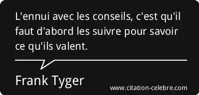 Citation Frank Tyger savoir : L'ennui avec les conseils, c'est qu'il faut d'abord les suivre...