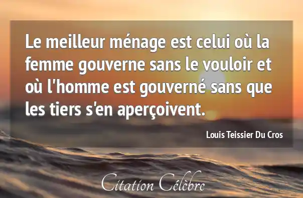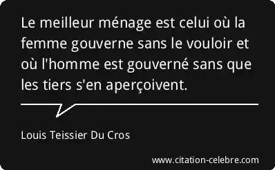 Le meilleur ménage est celui où la femme gouverne sans le vouloir et où l'homme est gouverné sans que les tiers s'en aperçoivent.