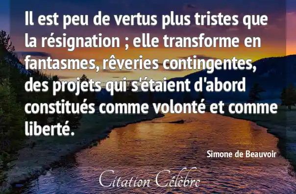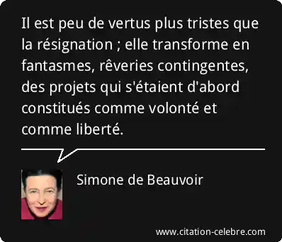 Il est peu de vertus plus tristes que la résignation ; elle transforme en fantasmes, rêveries contingentes, des projets qui s'étaient d'abord constitués comme volonté et comme liberté.