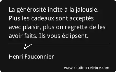 La générosité incite à la jalousie. Plus les cadeaux sont acceptés avec plaisir, plus on regrette de les avoir faits. Ils vous éclipsent.