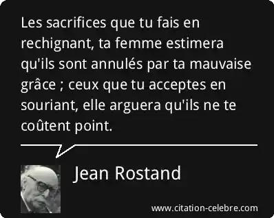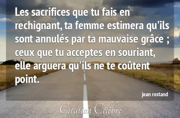 Les sacrifices que tu fais en rechignant, ta femme estimera qu'ils sont annulés par ta mauvaise grâce ; ceux que tu acceptes en souriant, elle arguera qu'ils ne te coûtent point.