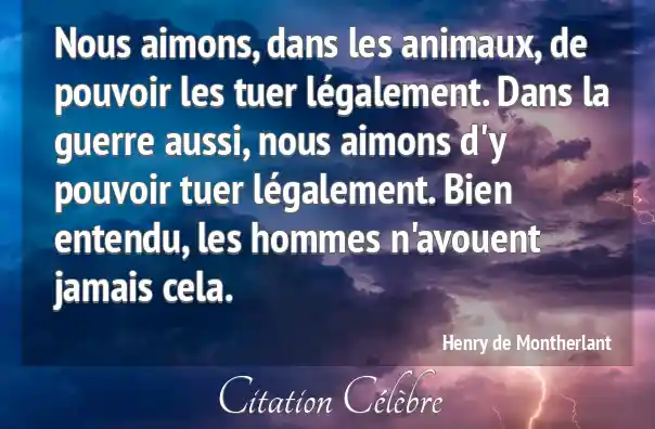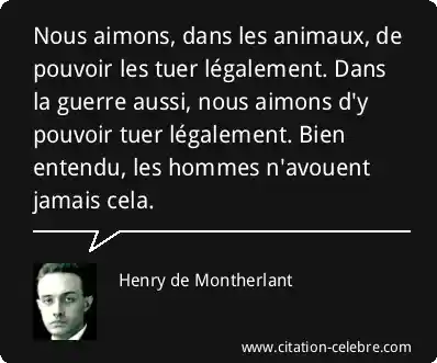 Nous aimons, dans les animaux, de pouvoir les tuer légalement. Dans la guerre aussi, nous aimons d'y pouvoir tuer légalement. Bien entendu, les hommes n'avouent jamais cela.