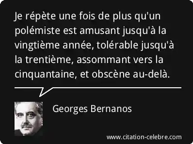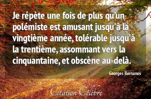 Je répète une fois de plus qu'un polémiste est amusant jusqu'à la vingtième année, tolérable jusqu'à la trentième, assommant vers la cinquantaine, et obscène au-delà.