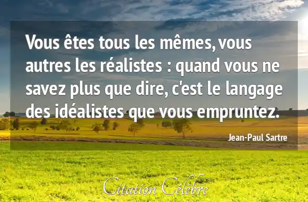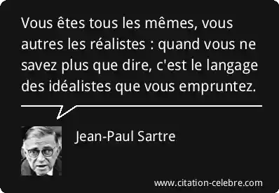 Vous êtes tous les mêmes, vous autres les réalistes : quand vous ne savez plus que dire, c'est le langage des idéalistes que vous empruntez.