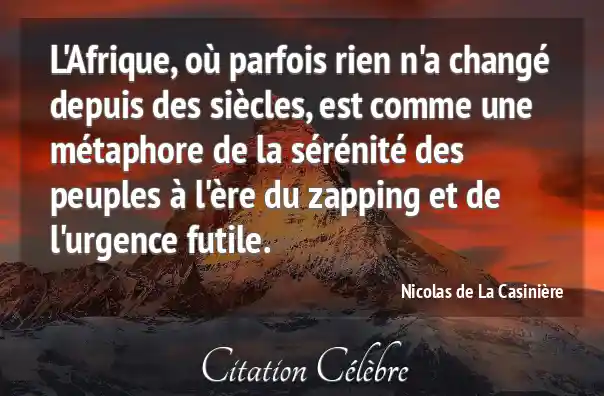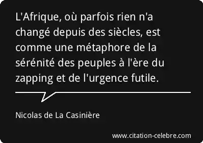 L'Afrique, où parfois rien n'a changé depuis des siècles, est comme une métaphore de la sérénité des peuples à l'ère du zapping et de l'urgence futile.