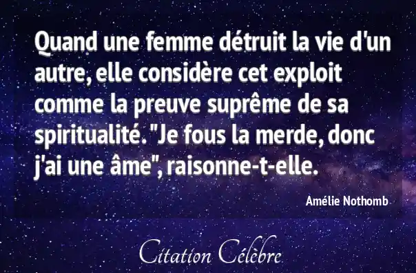 Quand une femme détruit la vie d'un autre, elle considère cet exploit comme la preuve suprême de sa spiritualité. "Je fous la merde, donc j'ai une âme", raisonne-t-elle.