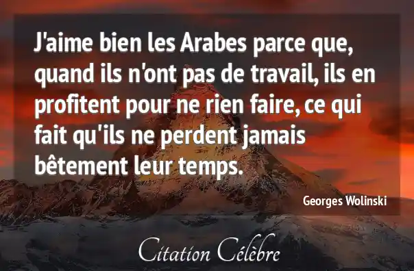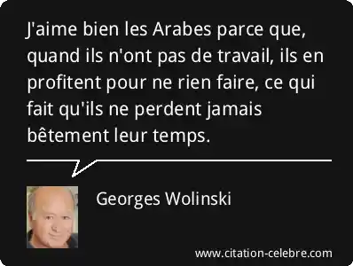 J'aime bien les Arabes parce que, quand ils n'ont pas de travail, ils en profitent pour ne rien faire, ce qui fait qu'ils ne perdent jamais bêtement leur temps.