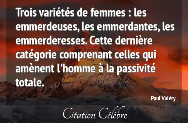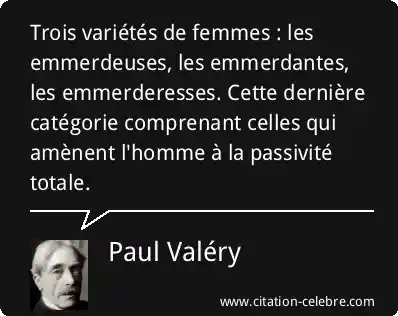 Trois variétés de femmes : les emmerdeuses, les emmerdantes, les emmerderesses. Cette dernière catégorie comprenant celles qui amènent l'homme à la passivité totale.