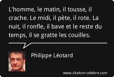 L'homme, le matin, il tousse, il crache. Le midi, il pète, il rote. La nuit, il ronfle, il bave et le reste du temps, il se gratte les couilles.