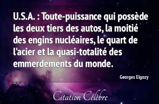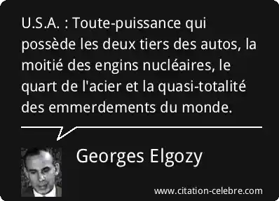 U.S.A. : Toute-puissance qui possède les deux tiers des autos, la moitié des engins nucléaires, le quart de l'acier et la quasi-totalité des emmerdements du monde.