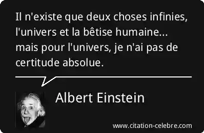 Cette célèbre formule d'Albert Einstein exprime avec une pointe d'humour noir et de sarcasme une observation sur la nature humaine. Elle affirme que seules deux choses semblent n'avoir aucune limite : l'immensité de l'univers et la stupidité des êtres humains. Le doute qu'il exprime sur le caractère infini de l'univers vient renforcer, par contraste, l'idée que la bêtise humaine est, elle, une certitude et semble véritablement sans fin.