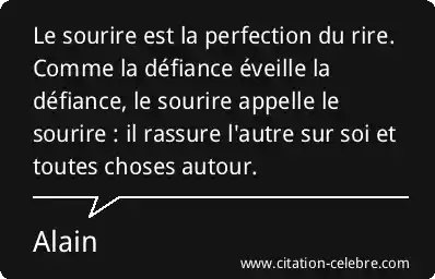 Le sourire est la perfection du rire. Comme la défiance éveille la défiance, le sourire appelle le sourire : il rassure l'autre sur soi et toutes choses autour.