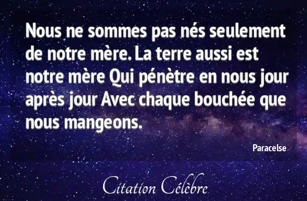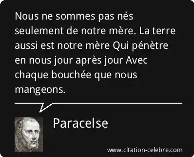 Nous ne sommes pas nés seulement de notre mère. La terre aussi est notre mère Qui pénètre en nous jour après jour Avec chaque bouchée que nous mangeons.