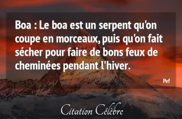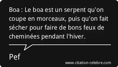 Boa : Le boa est un serpent qu'on coupe en morceaux, puis qu'on fait sécher pour faire de bons feux de cheminées pendant l'hiver.