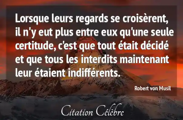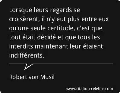 Lorsque leurs regards se croisèrent, il n'y eut plus entre eux qu'une seule certitude, c'est que tout était décidé et que tous les interdits maintenant leur étaient indifférents.
