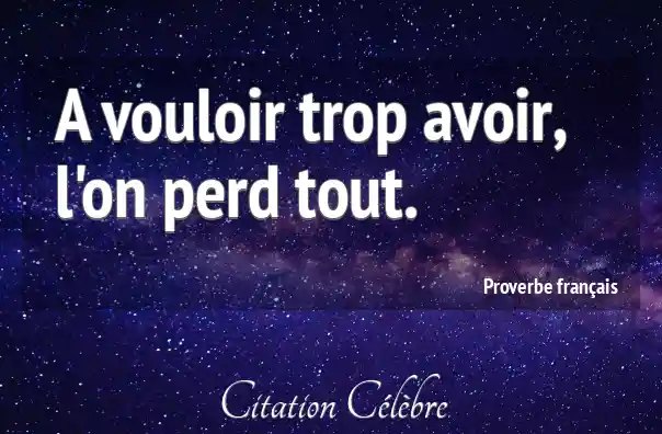 L'expression "À vouloir trop avoir, l'on perd tout" signifie de manière simple que si vous êtes excessivement gourmand ou ambitieux, en cherchant à accumuler toujours plus de biens, de richesses ou de pouvoir, vous risquez de vous retrouver finalement sans rien.