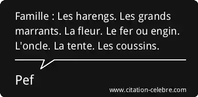 Famille : Les harengs. Les grands marrants. La fleur. Le fer ou engin. L'oncle. La tente. Les coussins.