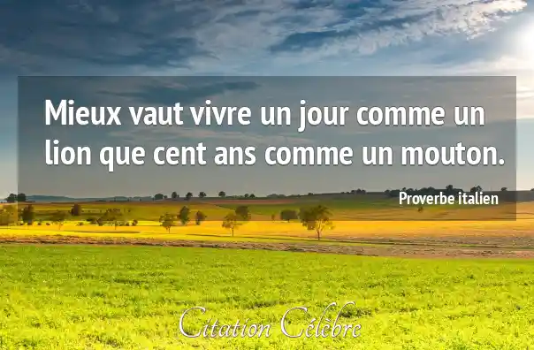 Ce proverbe, célèbre en Italie sous la forme "È meglio vivere un giorno da leone che cent'anni da pecora", a une origine qui remonterait à la Première Guerre mondiale. Il aurait été utilisé comme un slogan de propagande pour galvaniser les soldats italiens au front, notamment sur le Piave. Cependant, il a été popularisé de manière retentissante et largement diffusé par Benito Mussolini, qui l'a utilisé comme un de ses principaux slogans à partir de 1928, contribuant ainsi à son ancrage profond dans la culture populaire italienne.