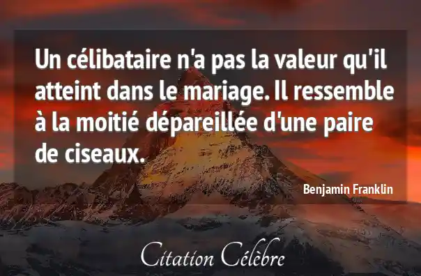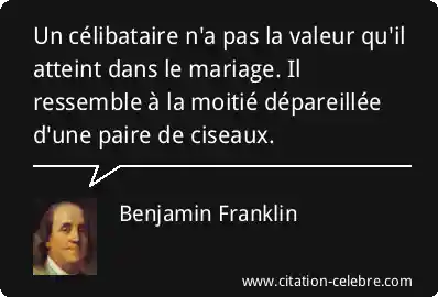 Un célibataire n'a pas la valeur qu'il atteint dans le mariage. Il ressemble à la moitié dépareillée d'une paire de ciseaux.