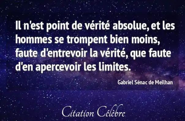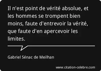 Il n'est point de vérité absolue, et les hommes se trompent bien moins, faute d'entrevoir la vérité, que faute d'en apercevoir les limites.