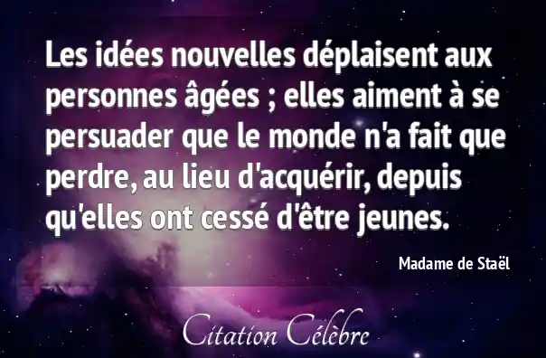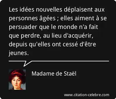 Les idées nouvelles déplaisent aux personnes âgées ; elles aiment à se persuader que le monde n'a fait que perdre, au lieu d'acquérir, depuis qu'elles ont cessé d'être jeunes.