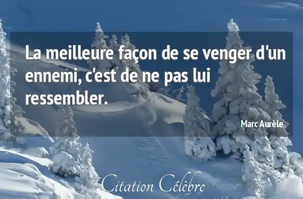 Cette puissante formule de Marc Aurèle, un empereur-philosophe stoïcien, exprime l'idée que la vengeance la plus noble et la plus efficace n'est pas l'action d'infliger une douleur ou une injustice en retour, mais plutôt de s'élever au-dessus de son adversaire. Ne pas lui ressembler signifie refuser d'adopter ses méthodes, ses défauts, ou son niveau moral. C'est une invitation à la grandeur d'âme et à la maîtrise de soi face à l'hostilité.