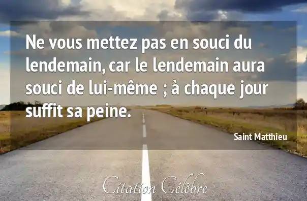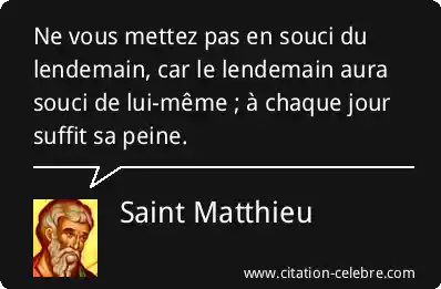 Ne vous mettez pas en souci du lendemain, car le lendemain aura souci de lui-même ; à chaque jour suffit sa peine.