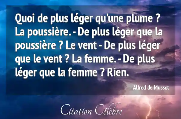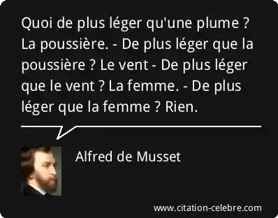Quoi de plus léger qu'une plume ? La poussière. - De plus léger que la poussière ? Le vent - De plus léger que le vent ? La femme. - De plus léger que la femme ? Rien.