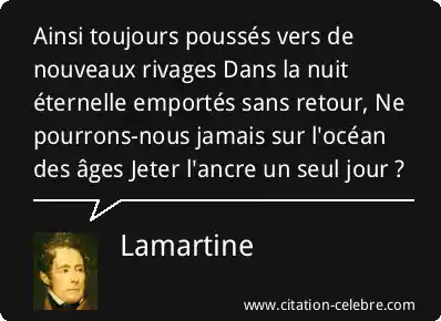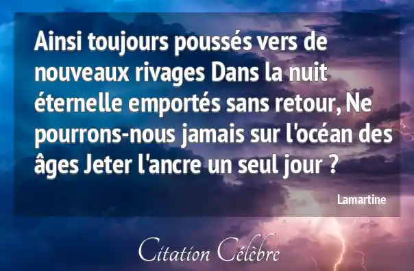 Ainsi toujours poussés vers de nouveaux rivages Dans la nuit éternelle emportés sans retour, Ne pourrons-nous jamais sur l'océan des âges Jeter l'ancre un seul jour ?