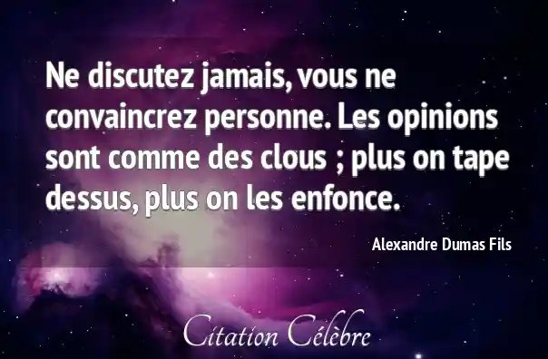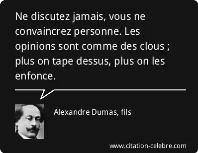 Ne discutez jamais, vous ne convaincrez personne. Les opinions sont comme des clous ; plus on tape dessus, plus on les enfonce.