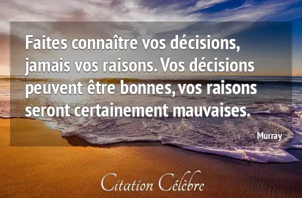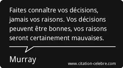 Faites connaître vos décisions, jamais vos raisons. Vos décisions peuvent être bonnes, vos raisons seront certainement mauvaises.
