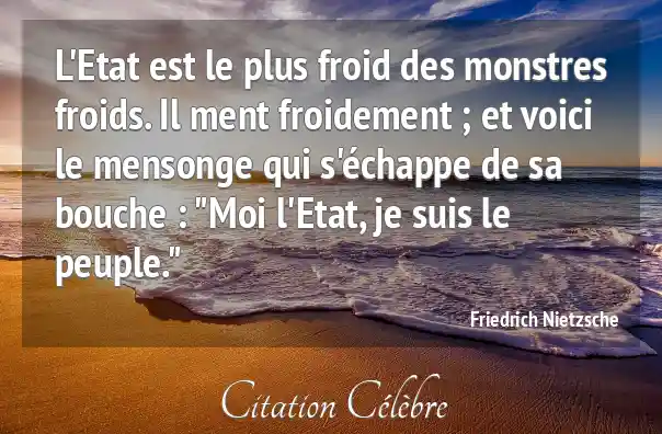 L'Etat est le plus froid des monstres froids. Il ment froidement ; et voici le mensonge qui s'échappe de sa bouche : "Moi l'Etat, je suis le peuple."