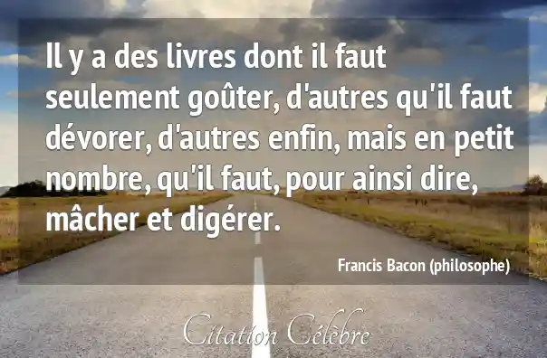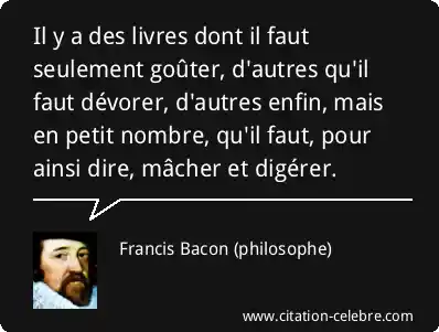 Il y a des livres dont il faut seulement goûter, d'autres qu'il faut dévorer, d'autres enfin, mais en petit nombre, qu'il faut, pour ainsi dire, mâcher et digérer.