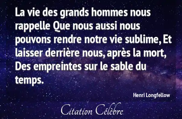 La vie des grands hommes nous rappelle Que nous aussi nous pouvons rendre notre vie sublime, Et laisser derrière nous, après la mort, Des empreintes sur le sable du temps.