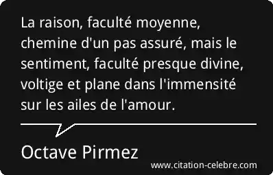 La raison, faculté moyenne, chemine d'un pas assuré, mais le sentiment, faculté presque divine, voltige et plane dans l'immensité sur les ailes de l'amour.