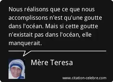 Nous réalisons que ce que nous accomplissons n'est qu'une goutte dans l'océan. Mais si cette goutte n'existait pas dans l'océan, elle manquerait.