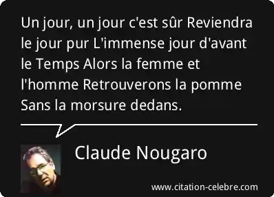 Un jour, un jour c'est sûr Reviendra le jour pur L'immense jour d'avant le Temps Alors la femme et l'homme Retrouverons la pomme Sans la morsure dedans.