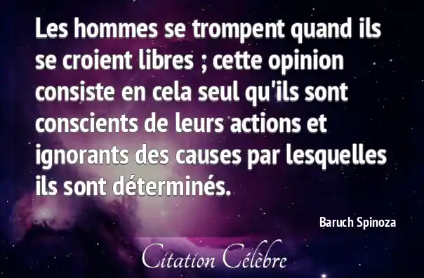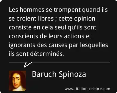 Les hommes se trompent quand ils se croient libres ; cette opinion consiste en cela seul qu'ils sont conscients de leurs actions et ignorants des causes par lesquelles ils sont déterminés.