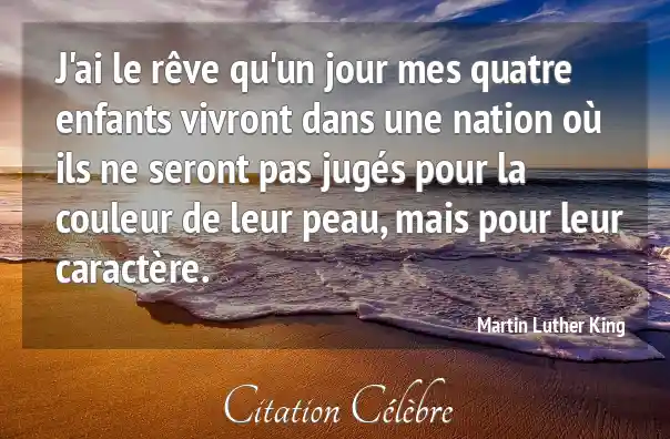J'ai le rêve qu'un jour mes quatre enfants vivront dans une nation où ils ne seront pas jugés pour la couleur de leur peau, mais pour leur caractère.