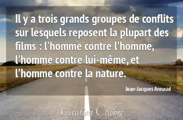 Il y a trois grands groupes de conflits sur lesquels reposent la plupart des films : l'homme contre l'homme, l'homme contre lui-même, et l'homme contre la nature.