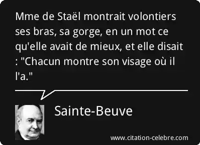 Mme de Staël montrait volontiers ses bras, sa gorge, en un mot ce qu'elle avait de mieux, et elle disait : "Chacun montre son visage où il l'a."