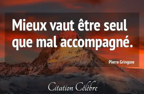 Cette citation, « Mieux vaut être seul que mal accompagné », exprime l'idée qu'il est préférable de choisir la solitude plutôt que de fréquenter des personnes dont l'influence est négative, nuisible, ou qui ne vous apportent rien de positif. Elle souligne l'importance de la qualité des relations humaines par rapport à leur simple quantité.